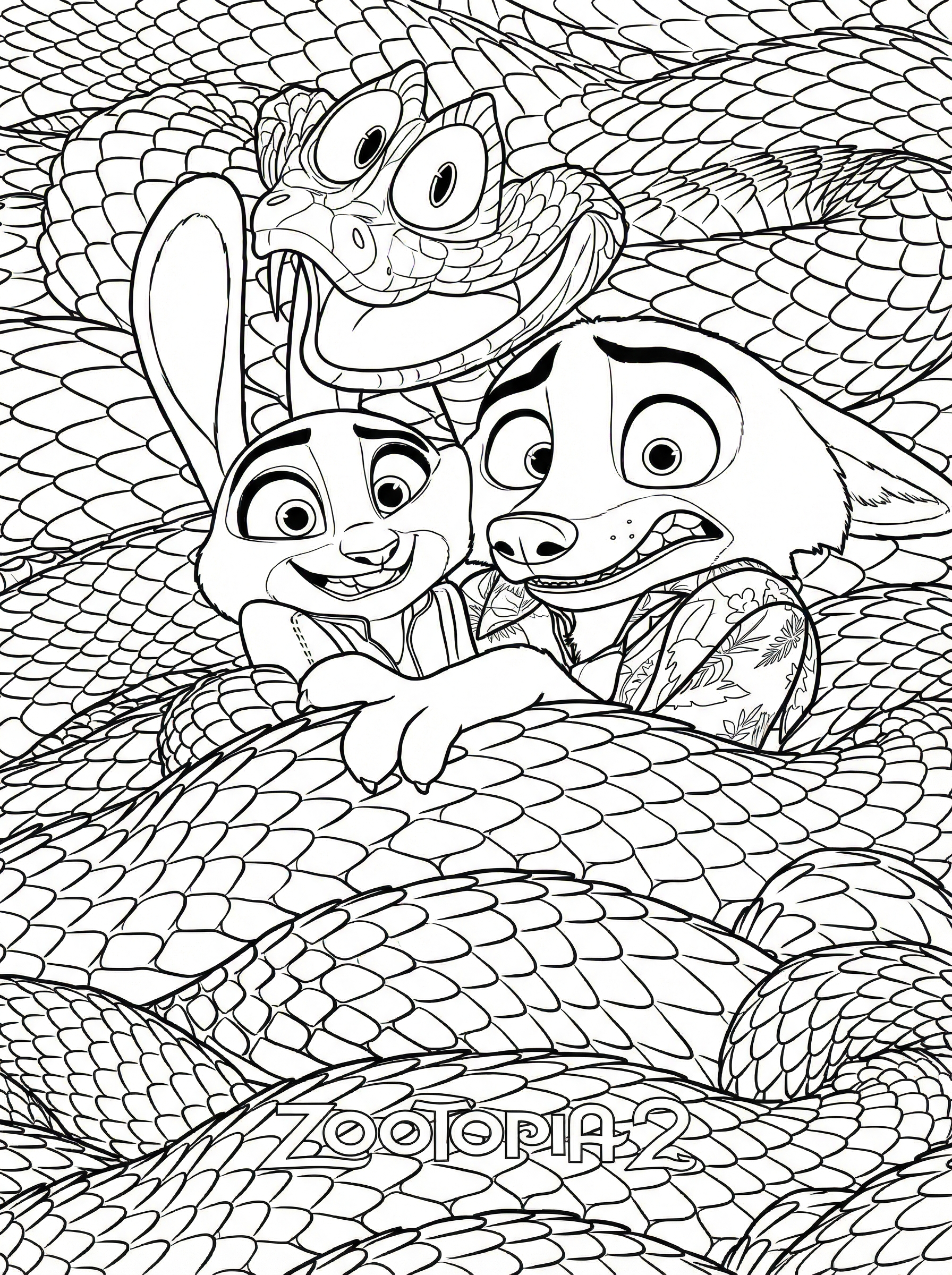 This free printable Zootopia 2 colouring page features beloved characters Judy Hopps and Nick Wilde on an exciting dragon adventure. The detailed illustration shows the determined rabbit police officer and clever fox detective riding atop a magnificent dragon with intricate scales covering the entire scene. This challenging colouring page is perfect for older children and Disney fans who enjoy detailed artwork. The complex scale patterns and character expressions provide an engaging colouring experience that will keep young artists entertained for hours. Print this free Zootopia 2 colouring sheet to bring the magic of Disney's animated world to life with your own creative colour choices. Ideal for rainy day activities, quiet time, or Disney-themed parties celebrating the upcoming 2025 film release.